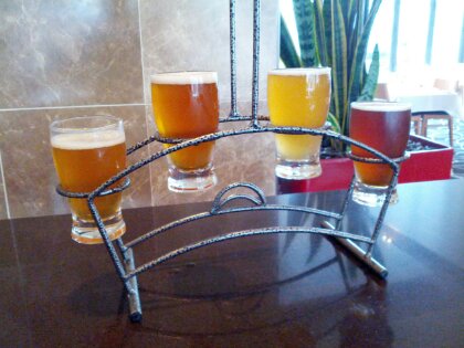 This week, things were different. The kid was having a sleepover at my parents, which meant I dropped her off and then had to drive past the microbrewery by myself. So of course I took advantage of the chance to stop in, take a photo of beer glasses and write some tasting notes (I was slightly unprepared on the latter score. Having no note pad, I had to use the white paper my lunch of hot chips came wrapped in to scrawl some observations. Tres unprofessional of me).