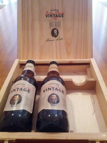 One cool thing that arrived in the mail recently was samples of this year’s edition of Coopers Extra Vintage Ale. The three bottles came in a beautiful wooden case – which you can see in the photo above. It’s not cheaply made either; it seems sturdy and the hinges and clasps don’t appear likely to bust any time soon.