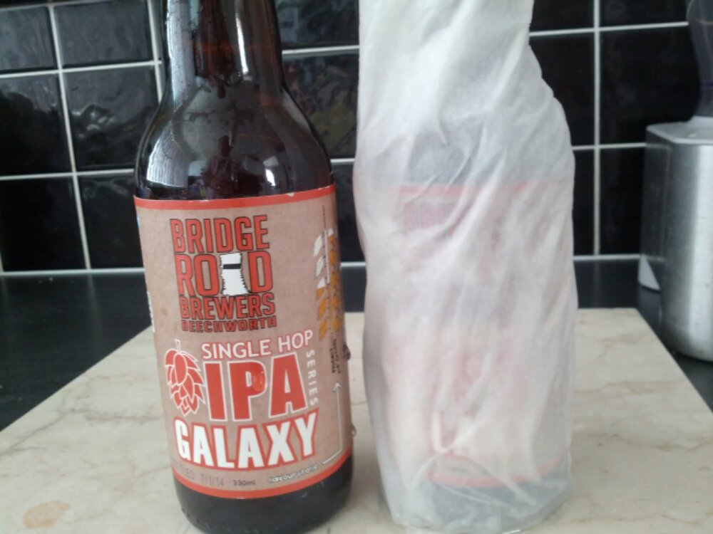 The experiment: We take two bottles of Bridge Road Brewers Galaxy IPA (chosen because it’s ultra-tasty). One of them is left au naturale. The other is wrapped in three linked sheets of paper towel, and then drenched under the cold water tap.